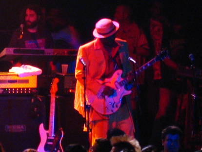 Of Montreal gets credit for using some of the best performance ideas of David Bowie, Peter Gabriel, the Residents, Prince, and Pink Floyd (Alan Parker). While a surplus of eight musicians underlined the beat (or just waved their arms in the air), impressively costumed dancers elbowed their way to the edge of the stage. This unwieldy ensemble made even the generous Canopy stage seem unmanageably cramped, with randomly-attired stage hands (one in white t-shirt, one in shirt and tie) dashing back and forth to maneuver into place various large props.