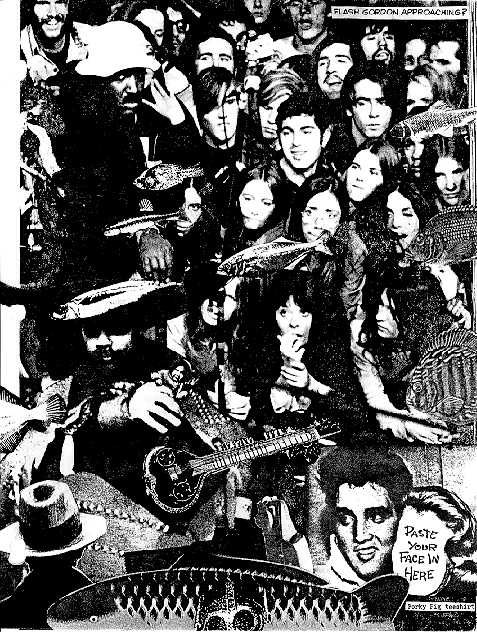 the collage was to be a carefully staged reenactment of the fatal concert at the Altamont Motor Speedway in 1969. the concert, however, was not to end with a brutal death but with the Hells Angels and teenagers joining hands as Mick Jagger gently cooed "You Can't Always Get What You Want But I Typically Can (Get What You Want)." strangely, the last great revisionist rock concert has been called on account of fish, the passing of a tranquil flock of silvergilled variables, glistening tails whipflicking rainbow droplets of beading moisture as they swim south. the atmosphere is taut with the silent screamdrama of deamtrauma as haphazard ragged teens press in towards the spectacle. the sitar drones with the wind of mind, fingered by the abstract spectre of Brian Jones. drugged Rolling Stones fans waiting for the opening act--the Residents--to begin concluding respond with sudden intakes of breath to the smooth and frictionless collision of scale and fingerskin. Vileness Fats is calm, defiant, has turned his back on his audience of diseased groupers and intoxicated bikers dazed and fossilized in private gasolinefume hysteria. Vileness Fats is calm, defiant, clutches the Louie doll as a sacred token. when its string is pulled it releases the squawking articulation of the hastily plagiarized phrase. Vileness Fats is calm, defiant, confronting his lawyer in a dark corner of the stage.